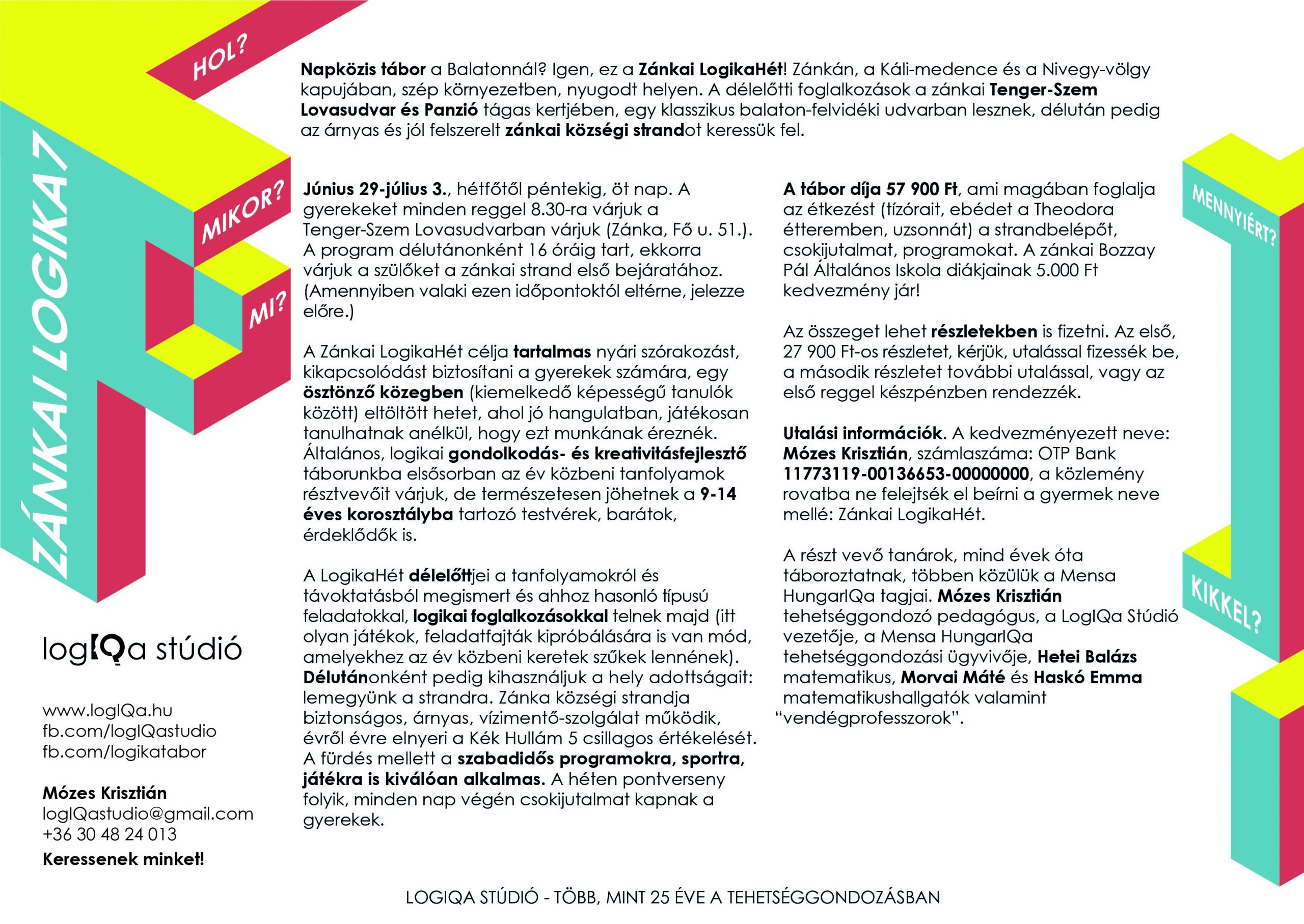 Napközis tábor a Balatonnál? Igen, ez a Zánkai LogikaHét! Zánkán, a Káli-medence és a Nivegy-völgy kapujában, szép környezetben, nyugodt helyen. A délelőtti foglalkozások a zánkai Tenger-szem Lovasudvar tágas, nyitott udvarán, a település szélén, a szőlők és a dombok közvetlen ölelésében lesznek, délután pedig az árnyas jól felszerelt zánkai községi strandot keressük fel.